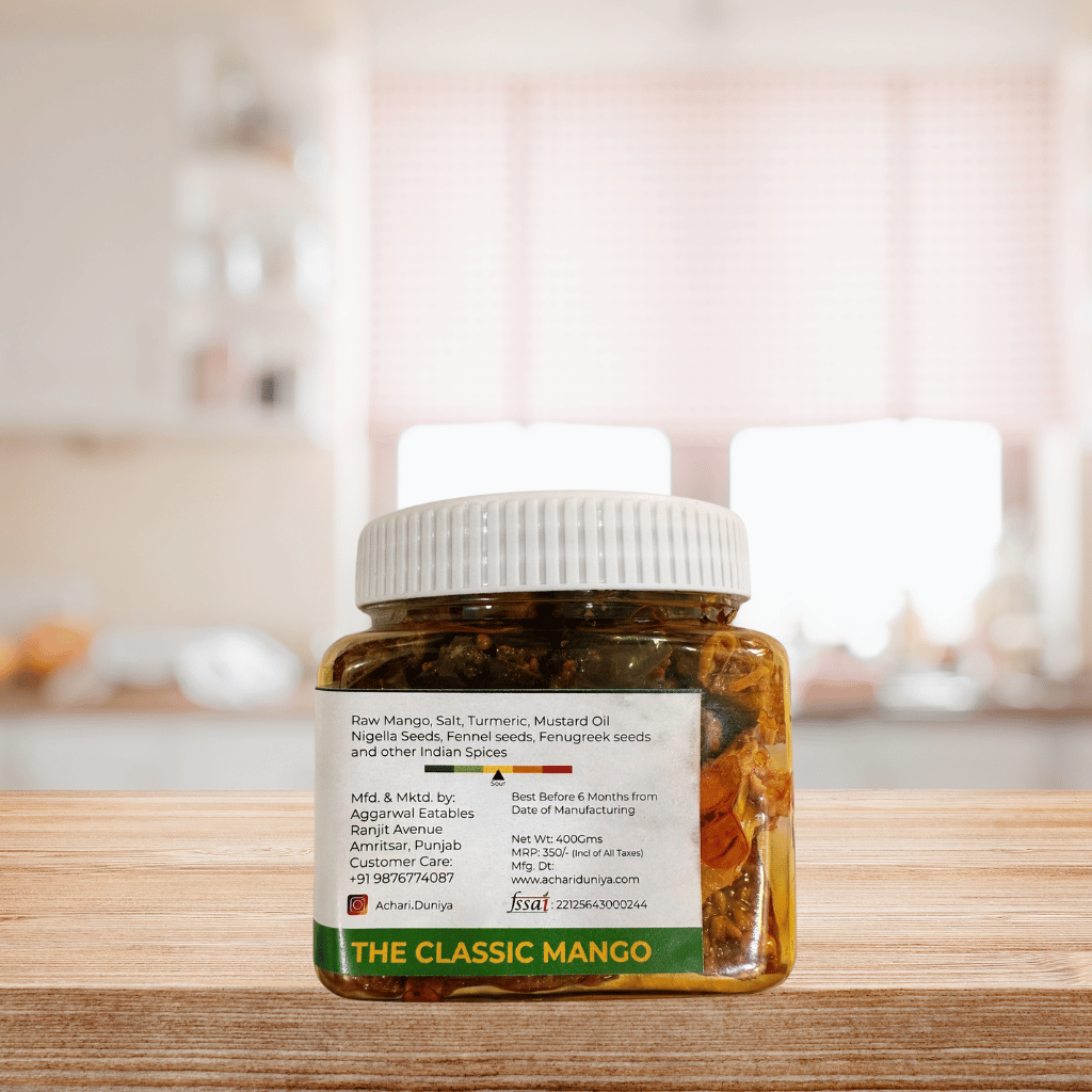 Savor the timeless taste of Achari Duniya’s Classic Mango Achar, a true embodiment of tradition and flavor. Made from handpicked raw mangoes, this pickle is infused with a perfect blend of aromatic spices, creating a rich, tangy, and mildly spicy delight.